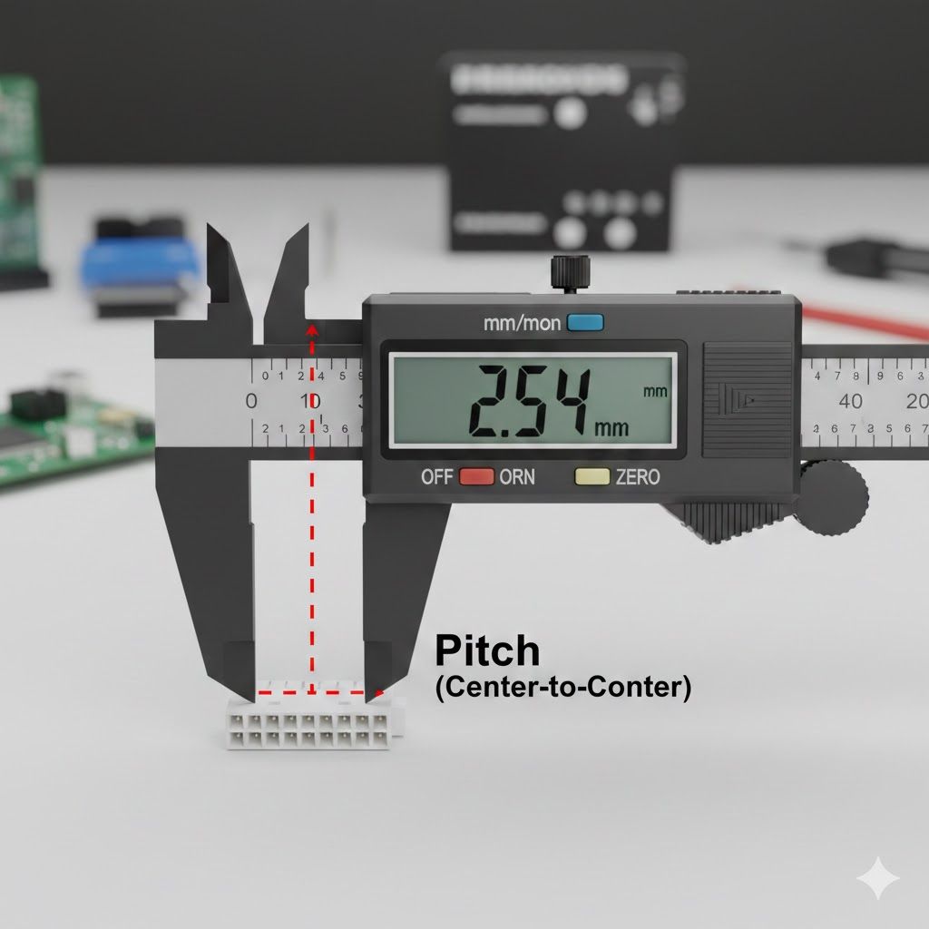 間距是指相鄰兩個端子中心點之間的距離。常見規格有 1.0mm, 1.25mm, 2.0mm, 2.54mm 等。正確測量方式應使用電子游標卡尺,測量第一支針腳中心到最後一支針腳中心的總長度,再除以(總針數-1)。